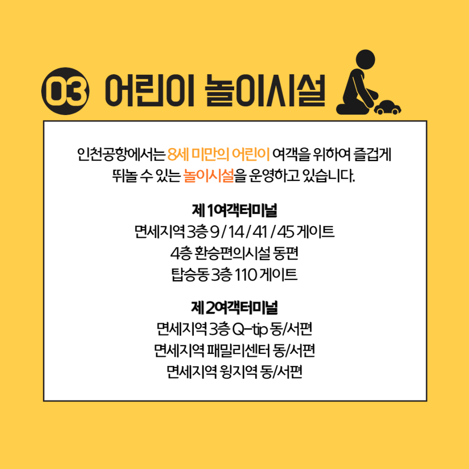 인천공항에서는 8세 미만의 어린이 여객을 위하여 즐겁게 뛰놀 수 있는 놀이시설을 운영하고 있습니다.