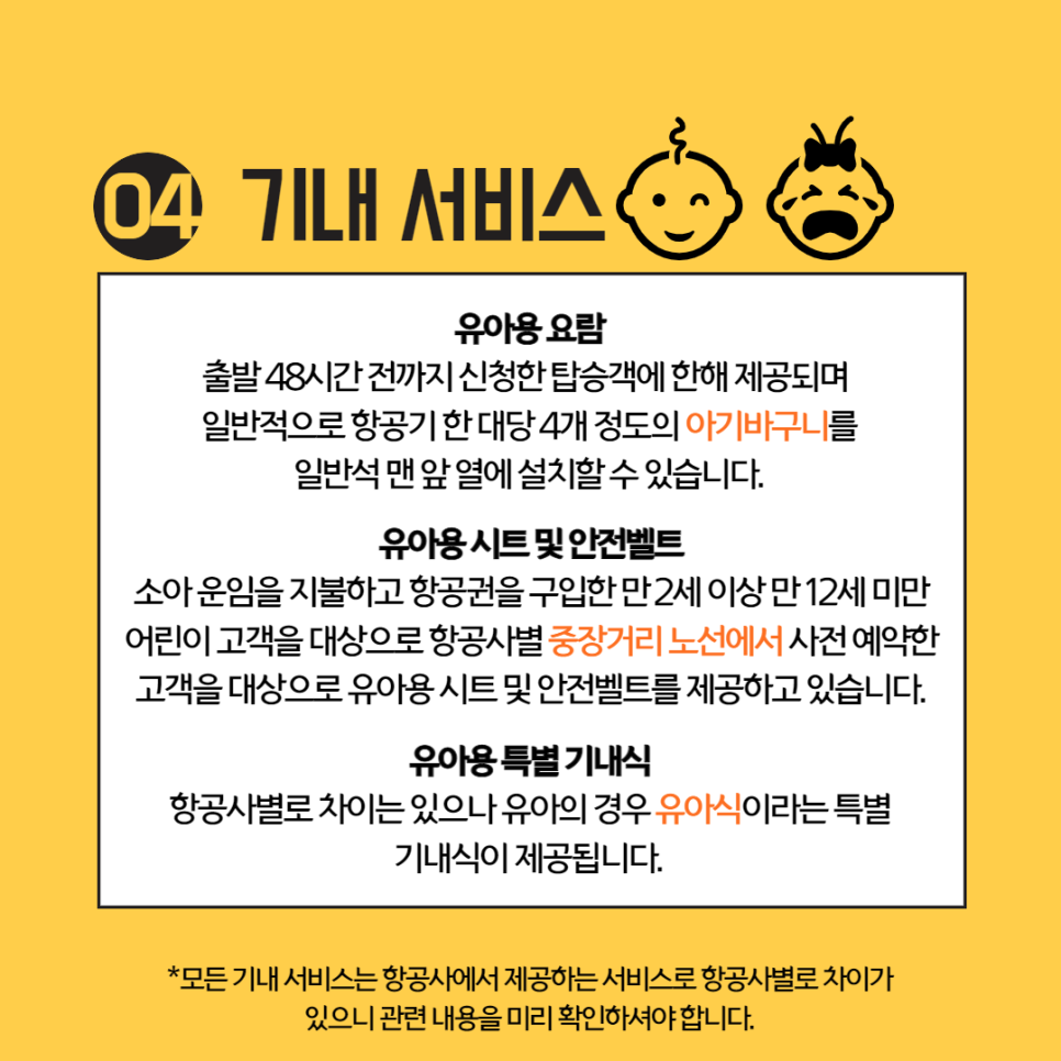 *모든 기내 서비스는 항공사에서 제공하는 서비스로 항공사별로 차이가 있으니 관련 내용을 미리 확인하셔야 합니다.