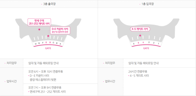 1층 4번게이트(24시간), 면세 252번게이트(07:00~21:00)